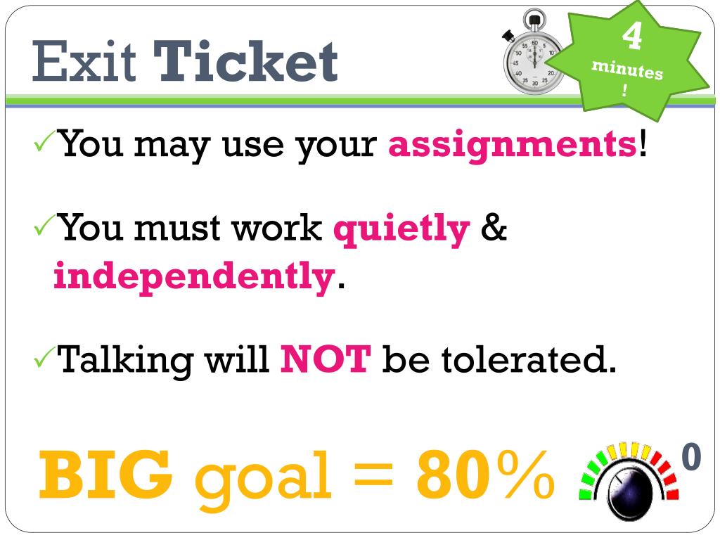Exit Ticket 4 minutes! 4 minutes! • You may use your assignments! • You must work quietly& independently. • Talking will NOT be tolerated. BIG goal = 80% 0