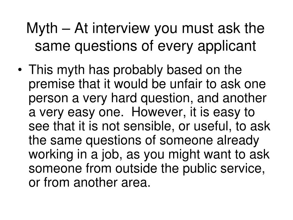 Myth – At interview you must ask the same questions of every applicant • This myth has probably based on the premise that it would be unfair to ask one person a very hard question, and another a very easy one. However, it is easy to see that it is not sensible, or useful, to ask the same questions of someone already working in a job, as you might want to ask someone from outside the public service, or from another area.
