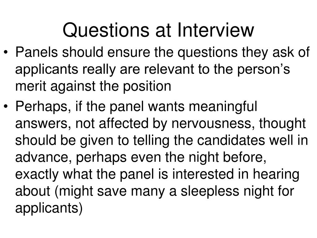 Questions at Interview • Panels should ensure the questions they ask of applicants really are relevant to the person’s merit against the position • Perhaps, if the panel wants meaningful answers, not affected by nervousness, thought should be given to telling the candidates well in advance, perhaps even the night before, exactly what the panel is interested in hearing about (might save many a sleepless night for applicants)
