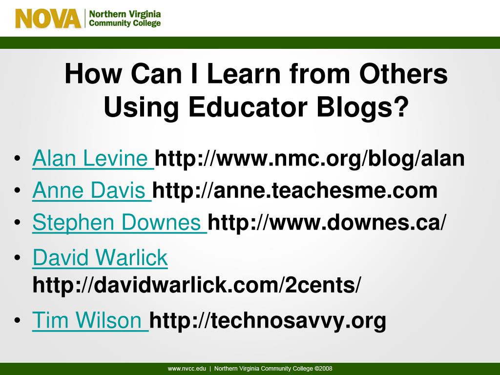 How Can I Learn from Others Using Educator Blogs? • Alan Levine http://www.nmc.org/blog/alan • Anne Davis http://anne.teachesme.com • Stephen Downes http://www.downes.ca/ • David Warlickhttp://davidwarlick.com/2cents/ • Tim Wilsonhttp://technosavvy.org