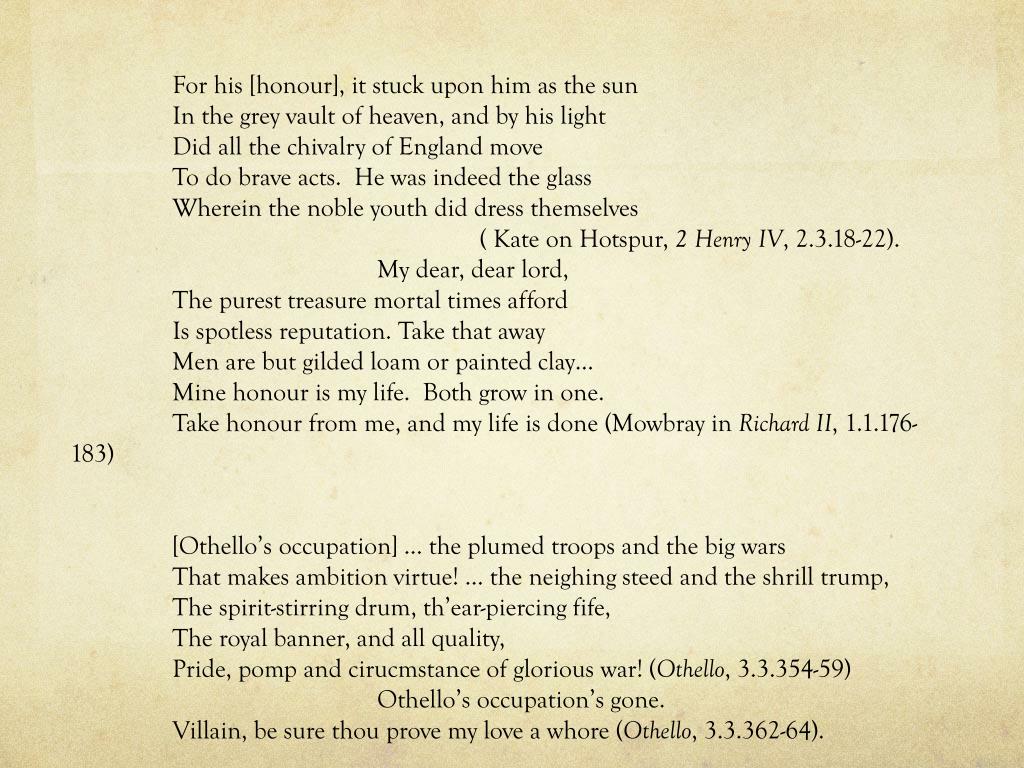 For his [honour], it stuck upon him as the sun In the grey vault of heaven, and by his light Did all the chivalry of England move To do brave acts. He was indeed the glass Wherein the noble youth did dress themselves ( Kate on Hotspur, 2 Henry IV, 2.3.18-22). My dear, dear lord, The purest treasure mortal times afford Is spotless reputation. Take that away Men are but gilded loam or painted clay… Mine honour is my life. Both grow in one. Take honour from me, and my life is done (Mowbray in Richard II, 1.1.176-183) [Othello’s occupation] … the plumed troops and the big wars That makes ambition virtue! … the neighing steed and the shrill trump, The spirit-stirring drum, th’ear-piercing fife, The royal banner, and all quality, Pride, pomp and cirucmstance of glorious war! (Othello, 3.3.354-59) Othello’s occupation’s gone. Villain, be sure thou prove my love a whore (Othello, 3.3.362-64). Yet she must die, else she’ll betray more men (Othello, 5.2.6).