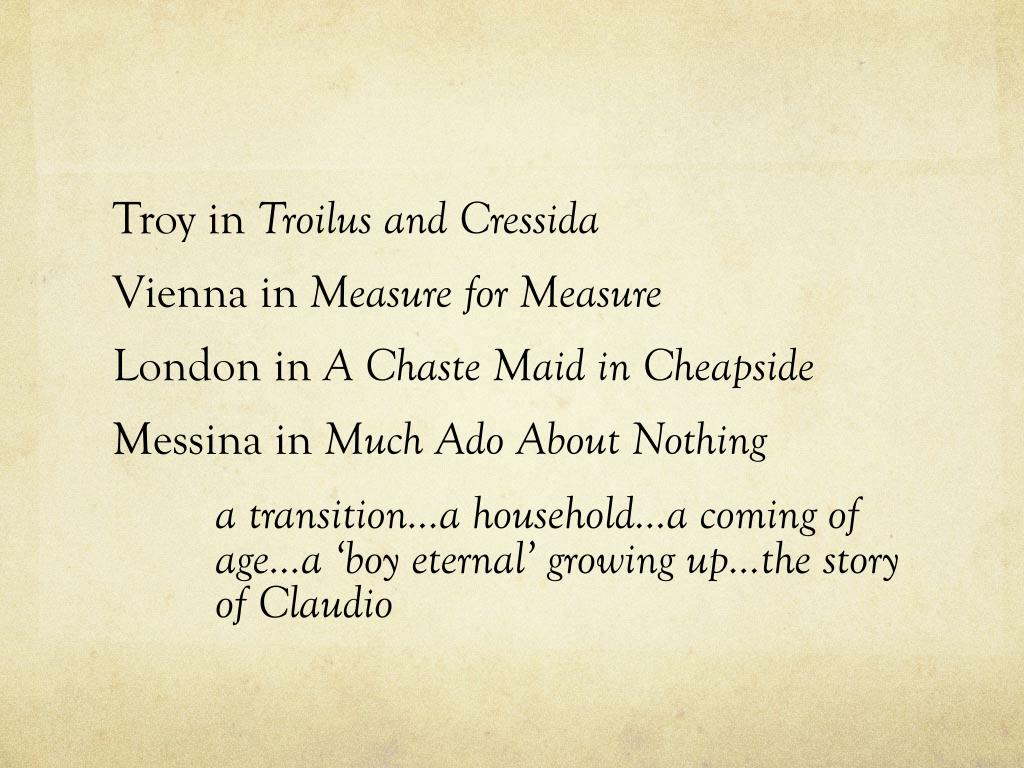 Troy in Troilus and Cressida Vienna in Measure for Measure London in A Chaste Maid in Cheapside Messina in Much Ado About Nothing a transition…a household…a coming of age…a ‘boy eternal’ growing up…the story of Claudio