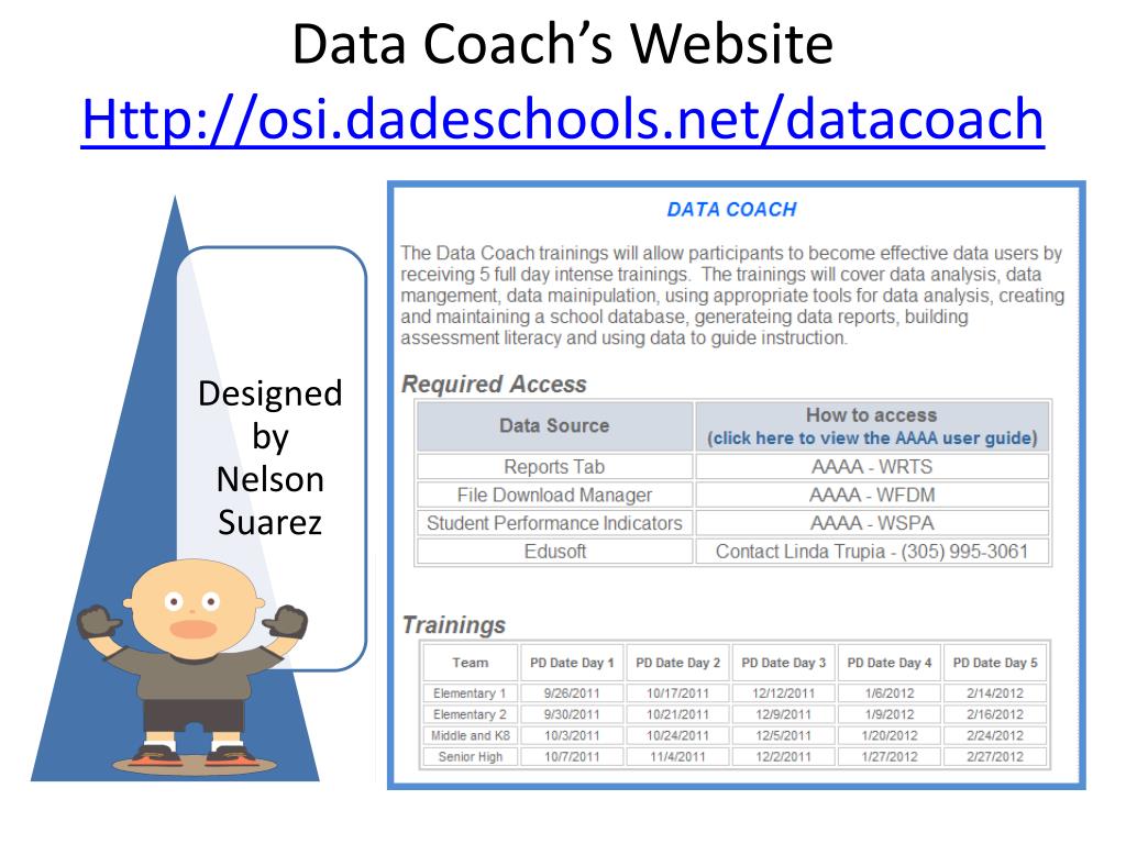 Data Coach Training Goal To enable data coaches to be effective data users that can assist administrators and teachers to use data to improve teaching and learning.