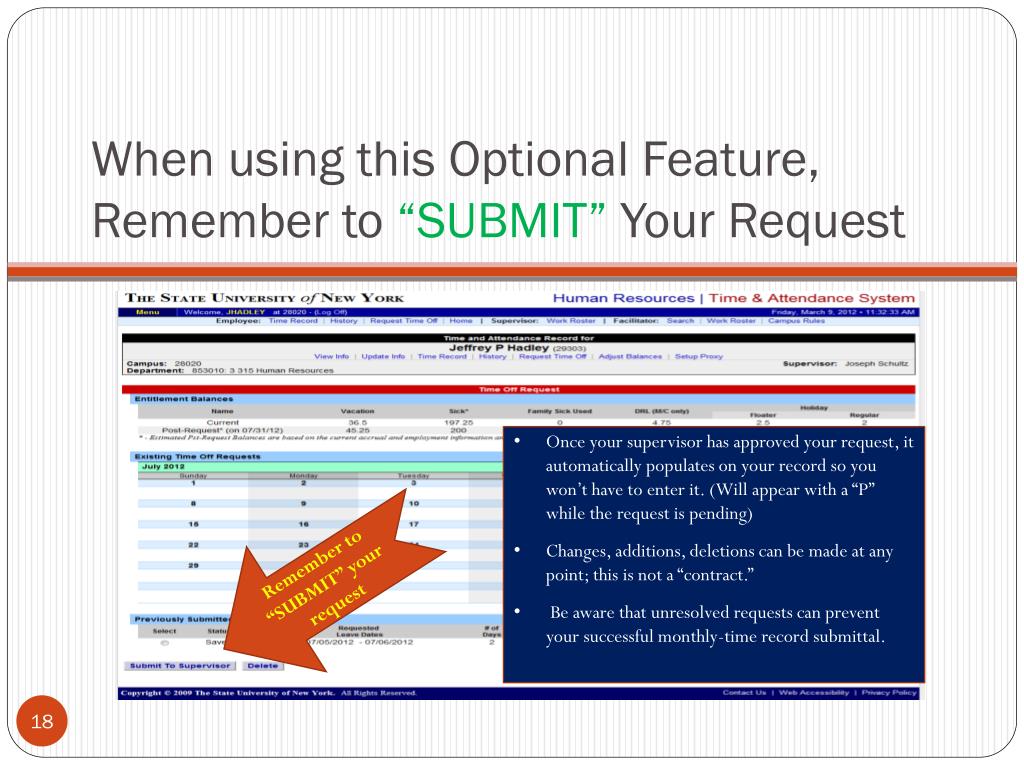 When using this Optional Feature,Remember to“SUBMIT” Your Request • Once your supervisor has approved your request, it automatically populates on your record so you won’t have to enter it. (Will appear with a “P” while the request is pending) • Changes, additions, deletions can be made at any point; this is not a “contract.” • Be aware that unresolved requests can prevent your successful monthly-time record submittal. Remember to “SUBMIT” your request