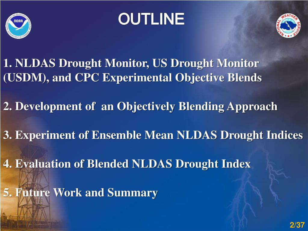 OUTLINE 1. NLDAS Drought Monitor, US Drought Monitor (USDM), and CPC Experimental Objective Blends 2. Development of an Objectively Blending Approach 3. Experiment of Ensemble Mean NLDAS Drought Indices 4. Evaluation of Blended NLDAS Drought Index 5. Future Work and Summary 2/37
