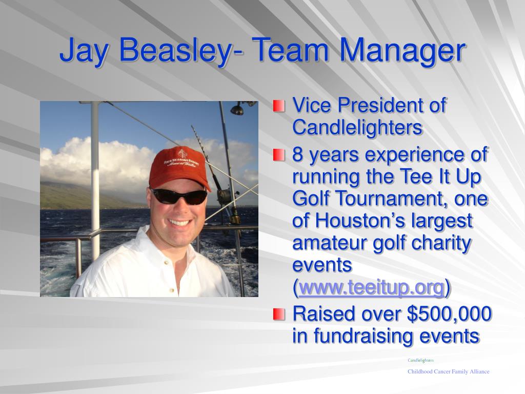 Jay Beasley- Team Manager • Vice President of Candlelighters • 8 years experience of running the Tee It Up Golf Tournament, one of Houston’s largest amateur golf charity events (www.teeitup.org) • Raised over $500,000 in fundraising events Candlelighters Childhood Cancer Family Alliance