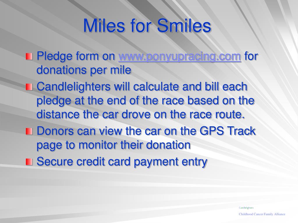 Miles for Smiles • Pledge form on www.ponyupracing.com for donations per mile • Candlelighters will calculate and bill each pledge at the end of the race based on the distance the car drove on the race route. • Donors can view the car on the GPS Track page to monitor their donation • Secure credit card payment entry Candlelighters Childhood Cancer Family Alliance