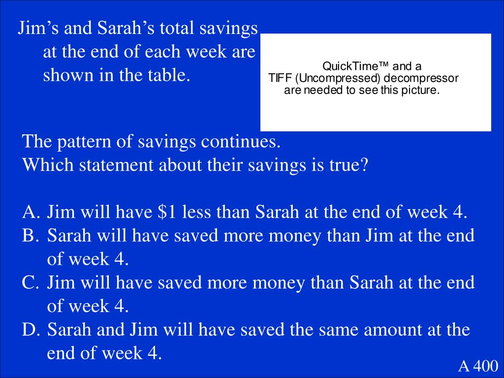 Jim’s and Sarah’s total savings at the end of each week are shown in the table. The pattern of savings continues. Which statement about their savings is true? Jim will have $1 less than Sarah at the end of week 4. Sarah will have saved more money than Jim at the end of week 4. Jim will have saved more money than Sarah at the end of week 4. Sarah and Jim will have saved the same amount at the end of week 4. A 400