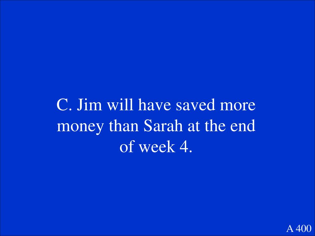 C. Jim will have saved more money than Sarah at the end of week 4. A 400