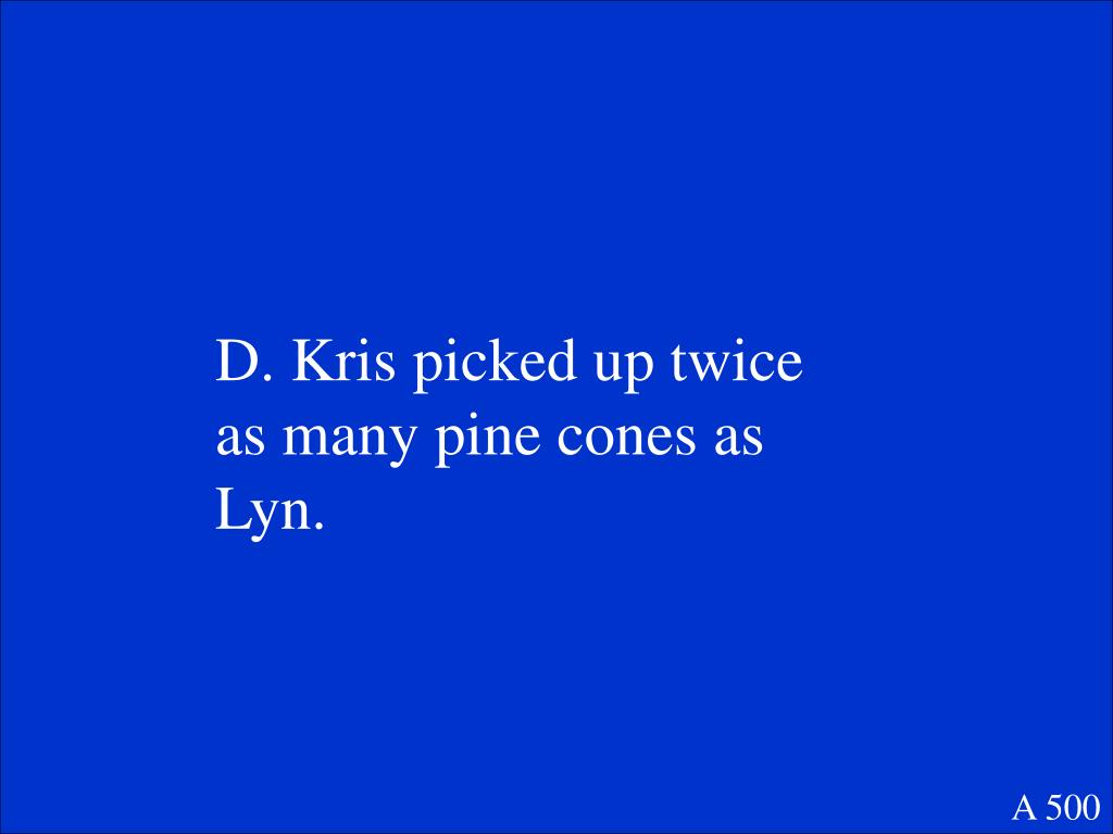 Lyn and Kris were picking up pine cones. Every 15 minutes they counted to check the total number of pine cones they had picked up. The chart shows their results. Which statement is true according to the data in the chart? Kris always picked up 8 more pine cones than Lyn. Kris and Lyn picked up the same number of pine cones every 15 minutes. Kris picked up fewer pine cones than Lyn. Kris picked up twice as many pine cones as Lyn. A 500