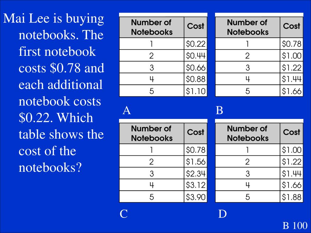 Mai Lee is buying notebooks. The first notebook costs $0.78 and each additional notebook costs $0.22. Which table shows the cost of the notebooks? A B C D B 100
