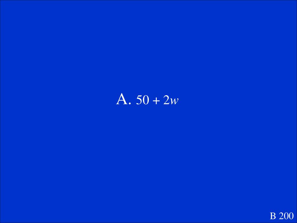 Susan saved 50 bottle caps for her school. She plans to save 2 more bottle caps each week. Which expression tells the total number of bottle caps Susan saves after w weeks? • 50 + 2w • 50 + 2 + w • 50w + 2 • 50w + 2w B 200