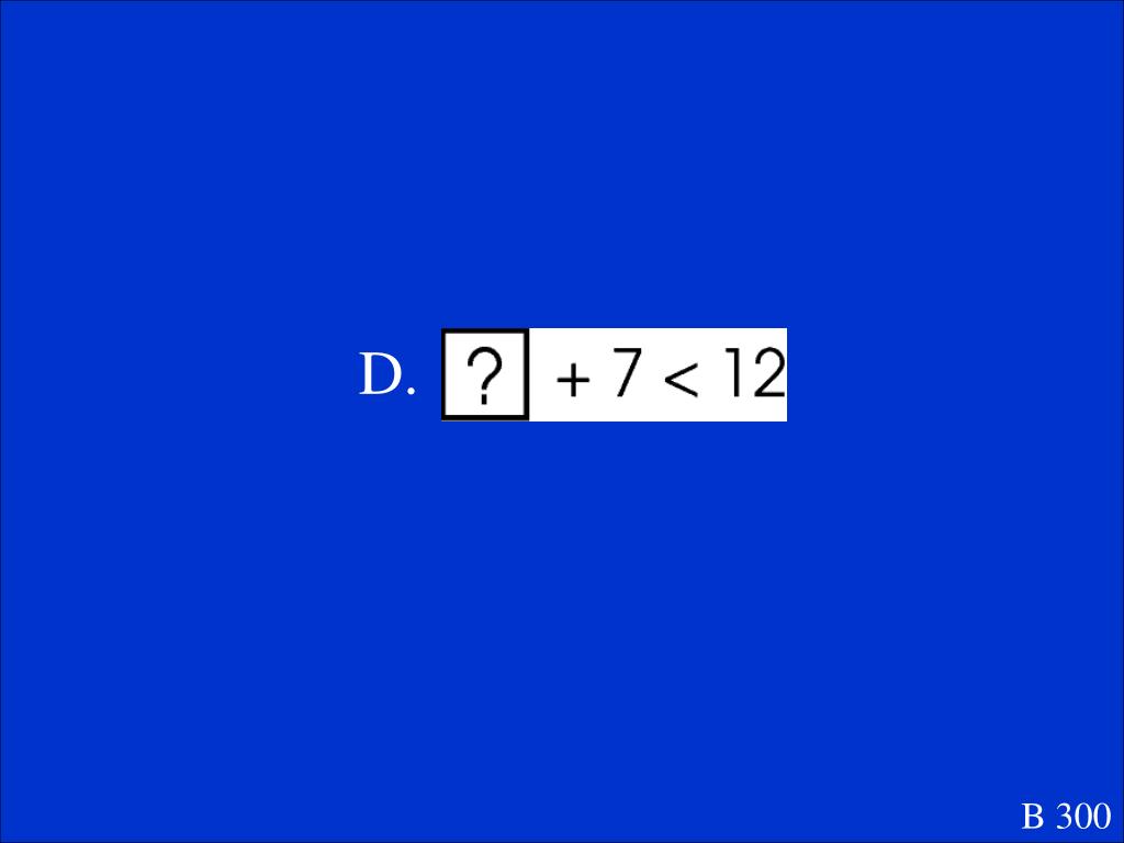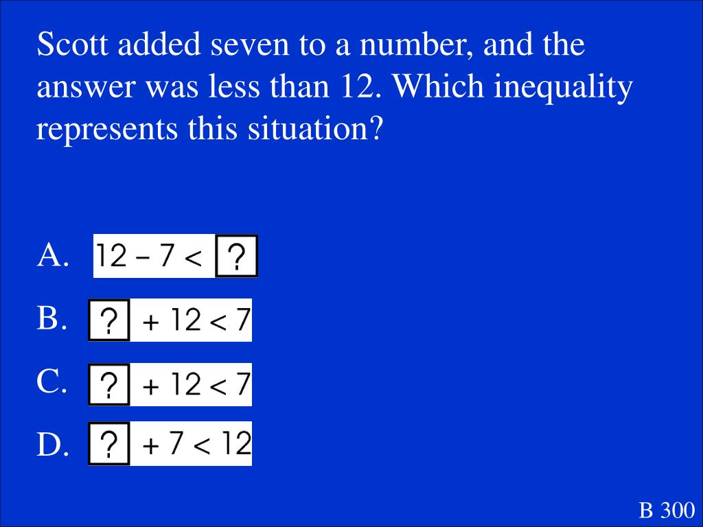 Scott added seven to a number, and the answer was less than 12. Which inequality represents this situation? A. B. C. D. B 300