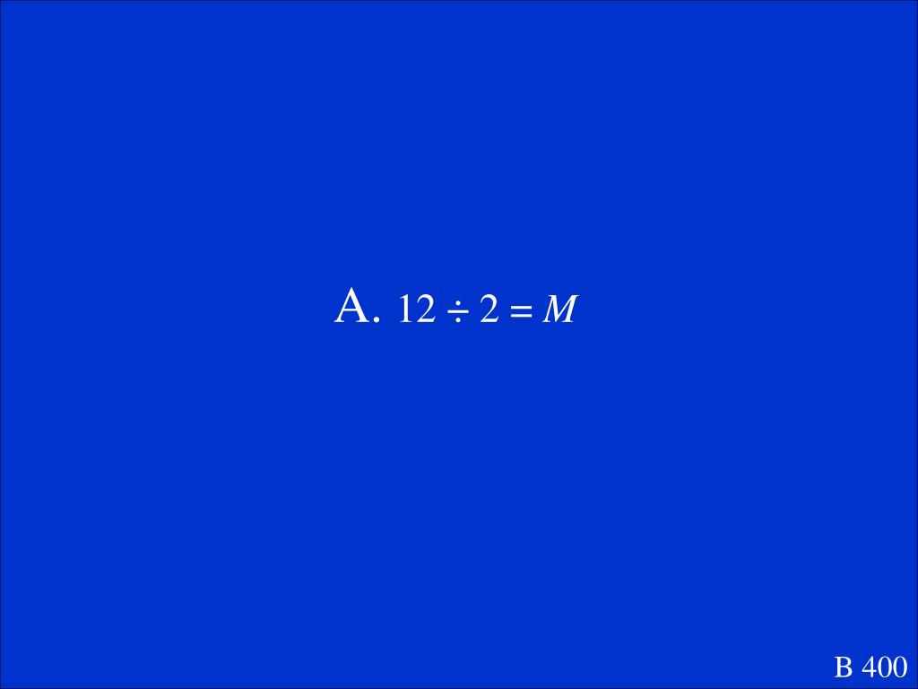 Alice has 12 markers. Ben has half as many markers as Alice. M is the number of markers that Ben has. Which equation can Ben use to find the number of markers that he has? • 12 ÷ 2 = M • 12 + 2 = M • 12 × 2 = M • 12 – 2 = M B 400