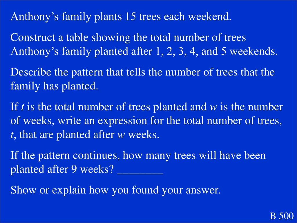 Anthony’s family plants 15 trees each weekend. Construct a table showing the total number of trees Anthony’s family planted after 1, 2, 3, 4, and 5 weekends. Describe the pattern that tells the number of trees that the family has planted. If t is the total number of trees planted and w is the number of weeks, write an expression for the total number of trees, t, that are planted after w weeks. If the pattern continues, how many trees will have been planted after 9 weeks? ________ Show or explain how you found your answer. B 500
