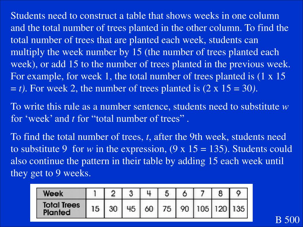 Students need to construct a table that shows weeks in one column and the total number of trees planted in the other column. To find the total number of trees that are planted each week, students can multiply the week number by 15 (the number of trees planted each week), or add 15 to the number of trees planted in the previous week. For example, for week 1, the total number of trees planted is (1 x 15 = t). For week 2, the number of trees planted is (2 x 15 = 30). To write this rule as a number sentence, students need to substitute w for ‘week’ and t for “total number of trees” . To find the total number of trees, t, after the 9th week, students need to substitute 9 for w in the expression, (9 x 15 = 135). Students could also continue the pattern in their table by adding 15 each week until they get to 9 weeks. B 500
