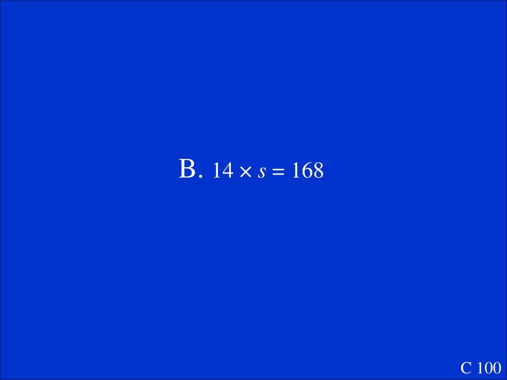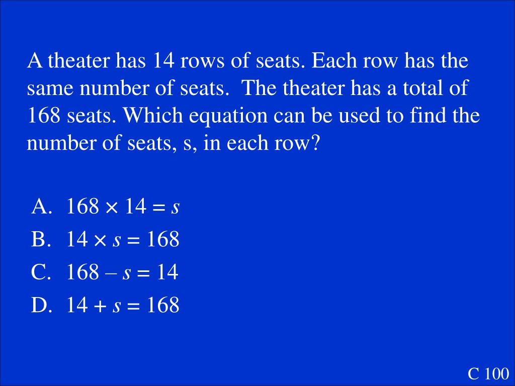 A theater has 14 rows of seats. Each row has the same number of seats. The theater has a total of 168 seats. Which equation can be used to find the number of seats, s, in each row? • 168 × 14 = s • 14 × s = 168 • 168 – s = 14 • 14 + s = 168 C 100