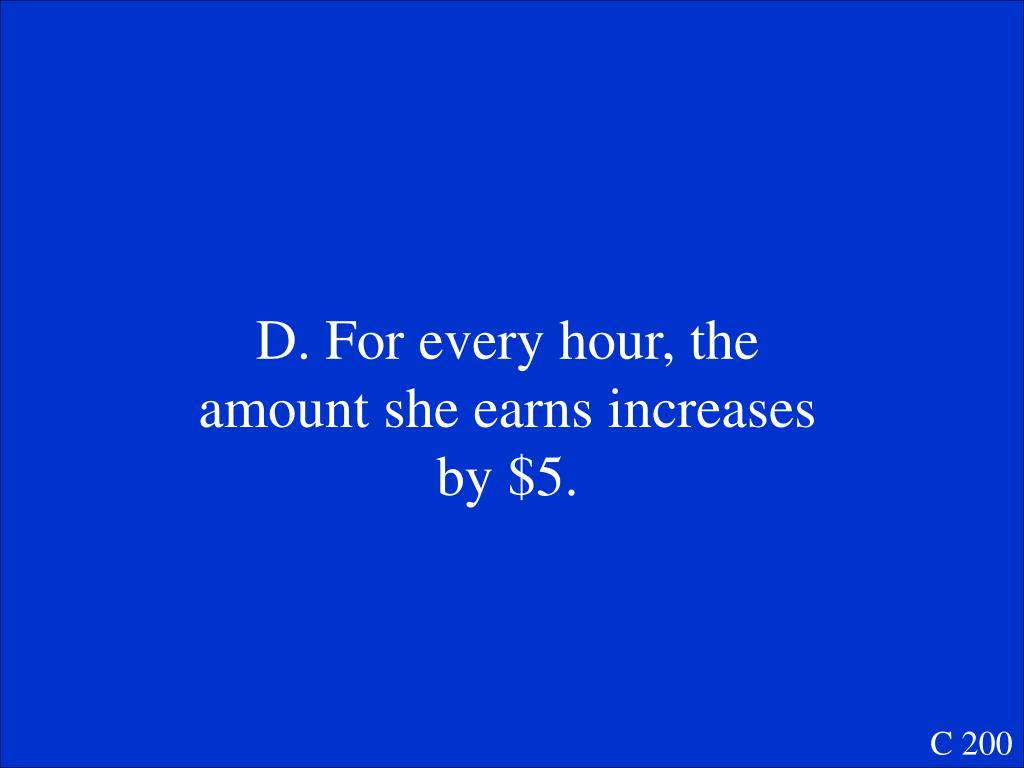 The graph shows Beth’s earnings while baby-sitting. Which statement describes how Beth’s total earnings change as the number of hours of baby-sitting increases? • For every hour, the amount she earns doubles. • For every five hours, the amount she earns increases by $1. • For every five hours, the amount she earns increases by $10. • For every hour, the amount she earns increases by $5. C 200