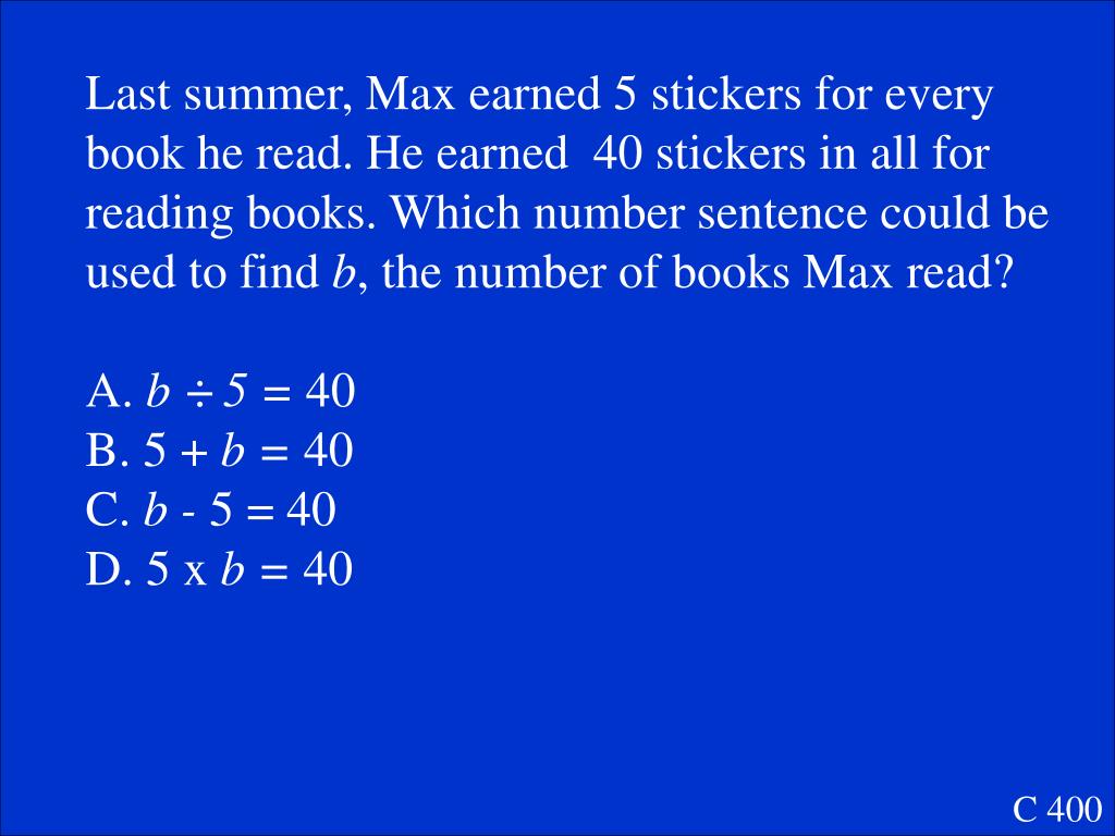 Last summer, Max earned 5 stickers for every book he read. He earned 40 stickers in all for reading books. Which number sentence could be used to find b, the number of books Max read? A. b ÷ 5 = 40 B. 5 + b = 40 C. b - 5 = 40 D. 5 x b = 40 C 400