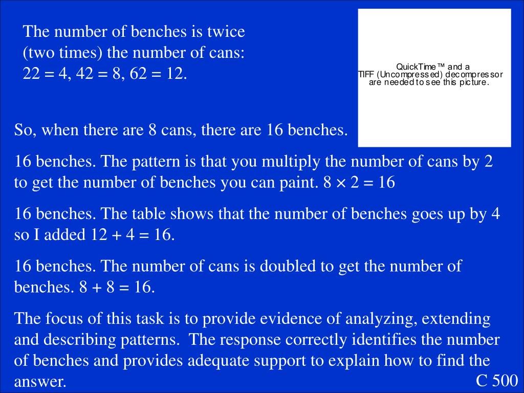 The number of benches is twice (two times) the number of cans: 22 = 4, 42 = 8, 62 = 12. So, when there are 8 cans, there are 16 benches. 16 benches. The pattern is that you multiply the number of cans by 2 to get the number of benches you can paint. 8 × 2 = 16 16 benches. The table shows that the number of benches goes up by 4 so I added 12 + 4 = 16. 16 benches. The number of cans is doubled to get the number of benches. 8 + 8 = 16. The focus of this task is to provide evidence of analyzing, extending and describing patterns. The response correctly identifies the number of benches and provides adequate support to explain how to find the answer. C 500