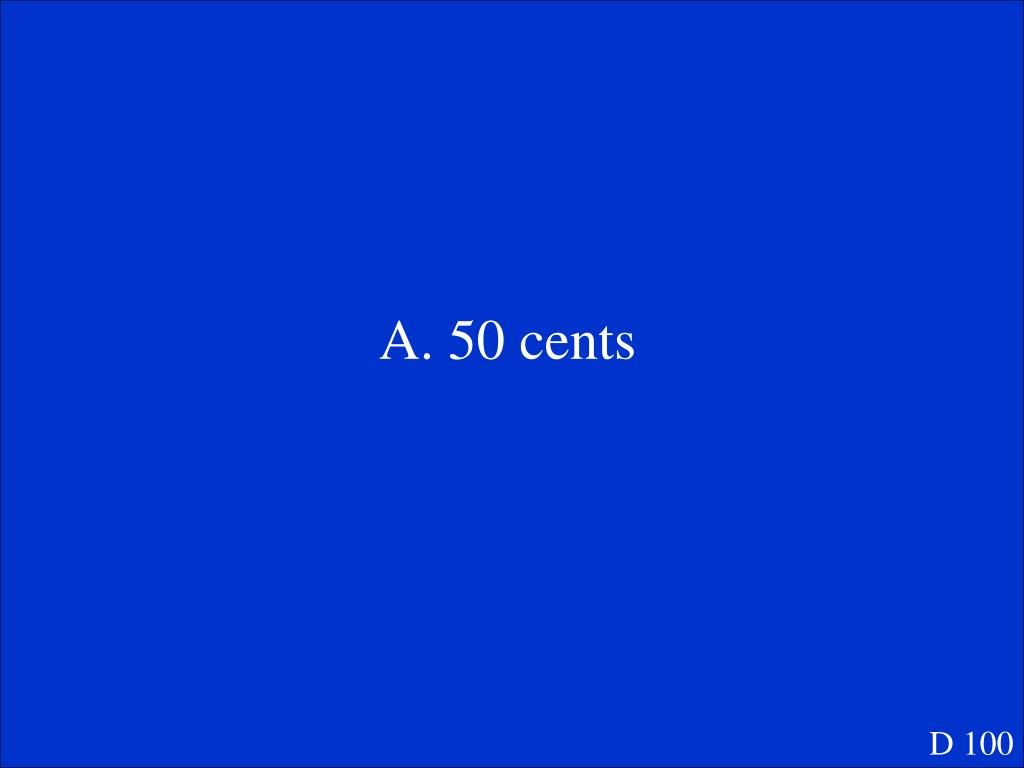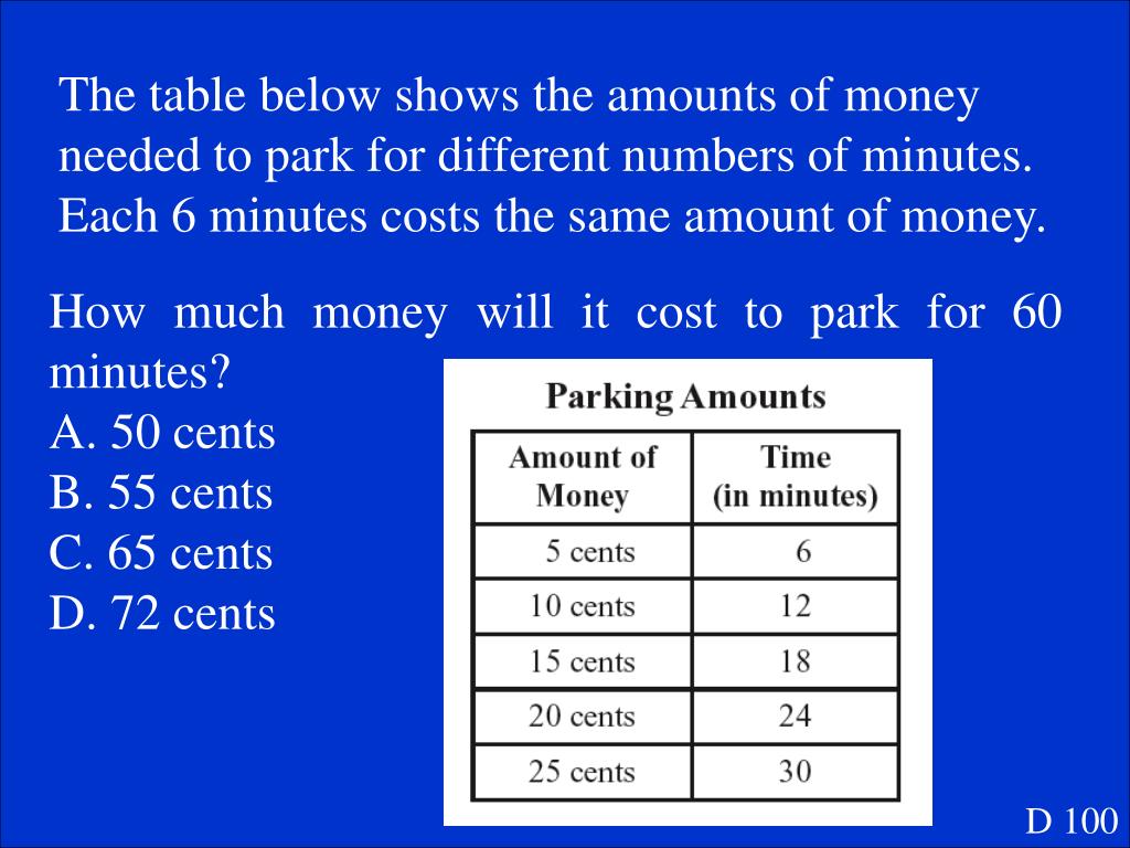 The table below shows the amounts of money needed to park for different numbers of minutes. Each 6 minutes costs the same amount of money. How much money will it cost to park for 60 minutes? A. 50 cents B. 55 cents C. 65 cents D. 72 cents D 100