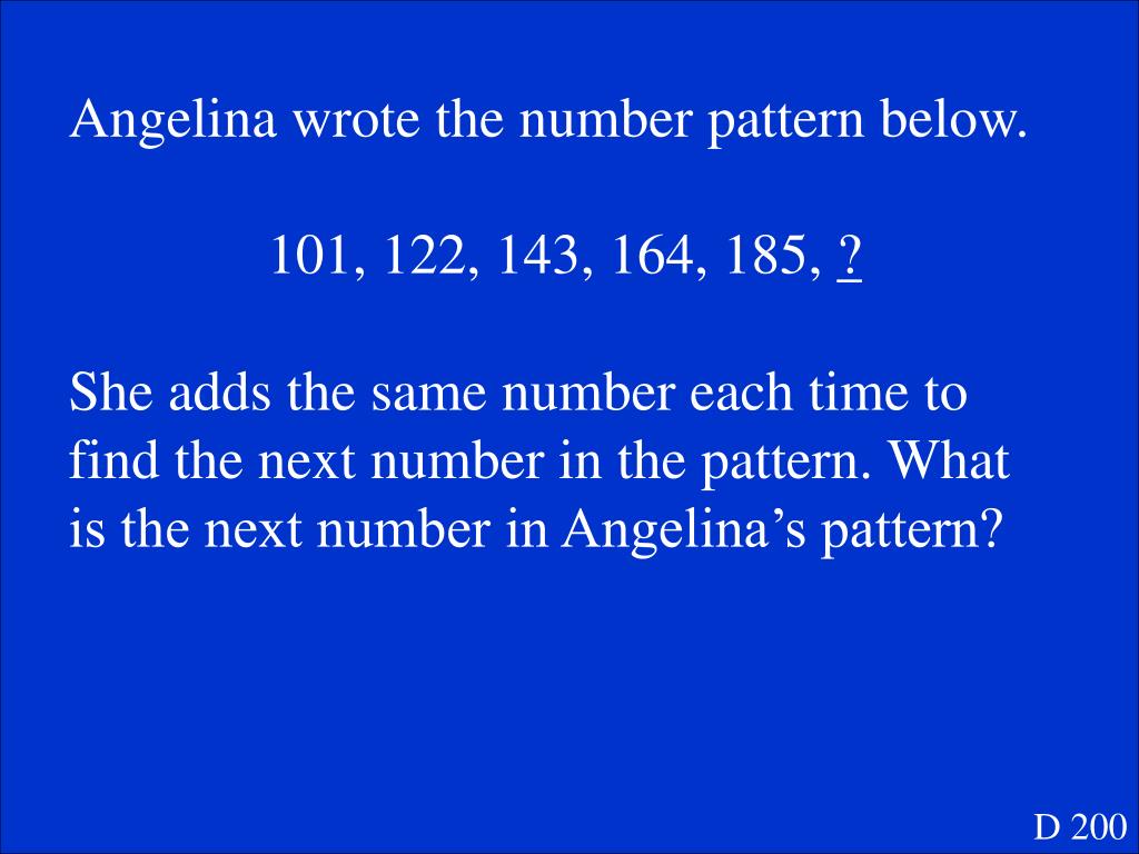 Angelina wrote the number pattern below. 101, 122, 143, 164, 185, ? She adds the same number each time to find the next number in the pattern. What is the next number in Angelina’s pattern? D 200