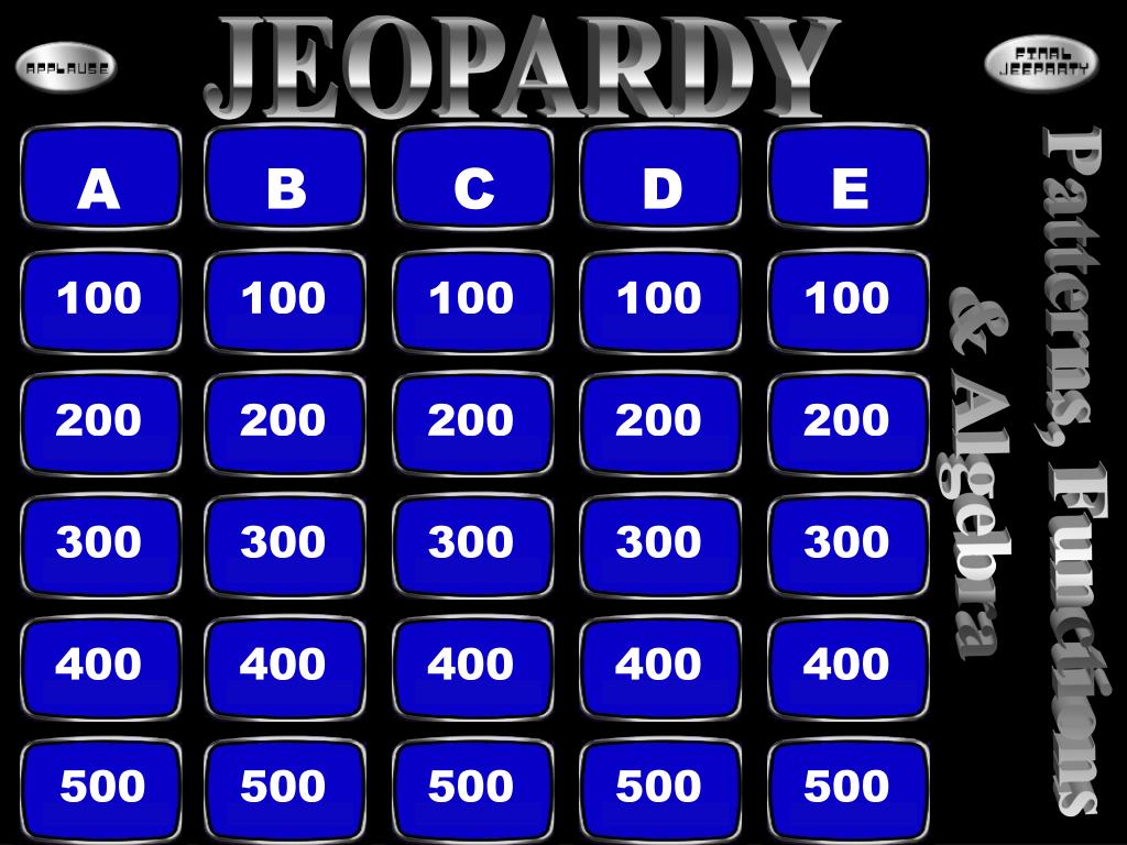 JEOPARDY A B C D E 100 100 100 100 100 200 200 200 200 200 Patterns, Functions & Algebra 300 300 300 300 300 400 400 400 400 400 500 500 500 500 500