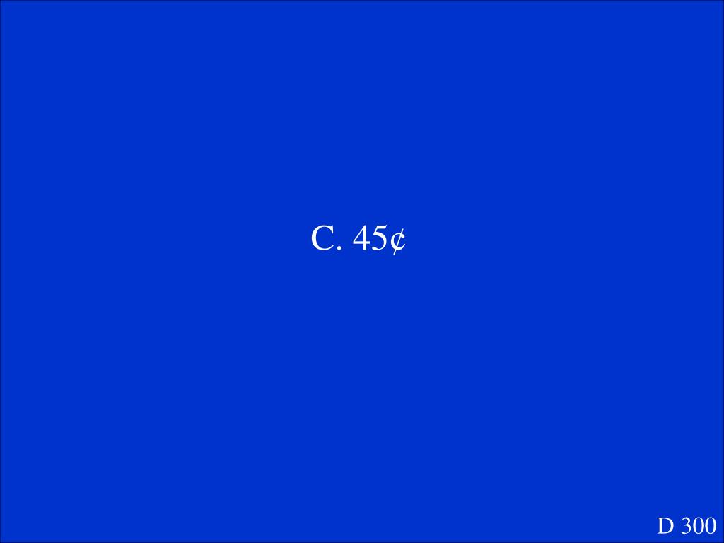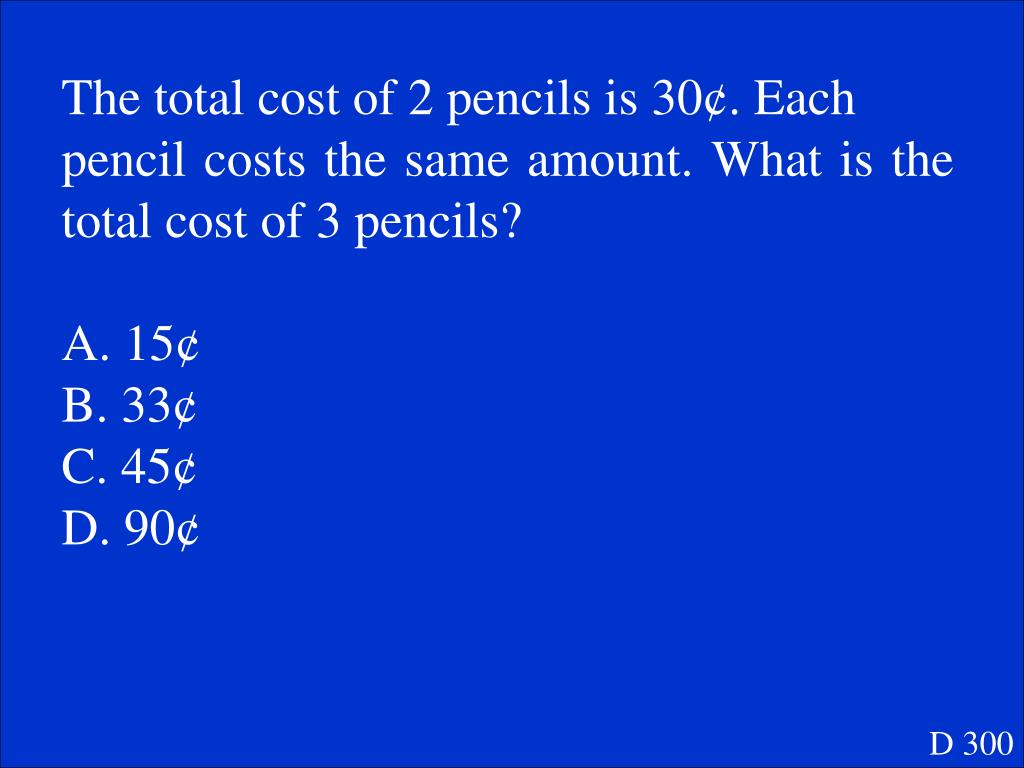 The total cost of 2 pencils is 30¢. Each pencil costs the same amount. What is the total cost of 3 pencils? A. 15¢ B. 33¢ C. 45¢ D. 90¢ D 300