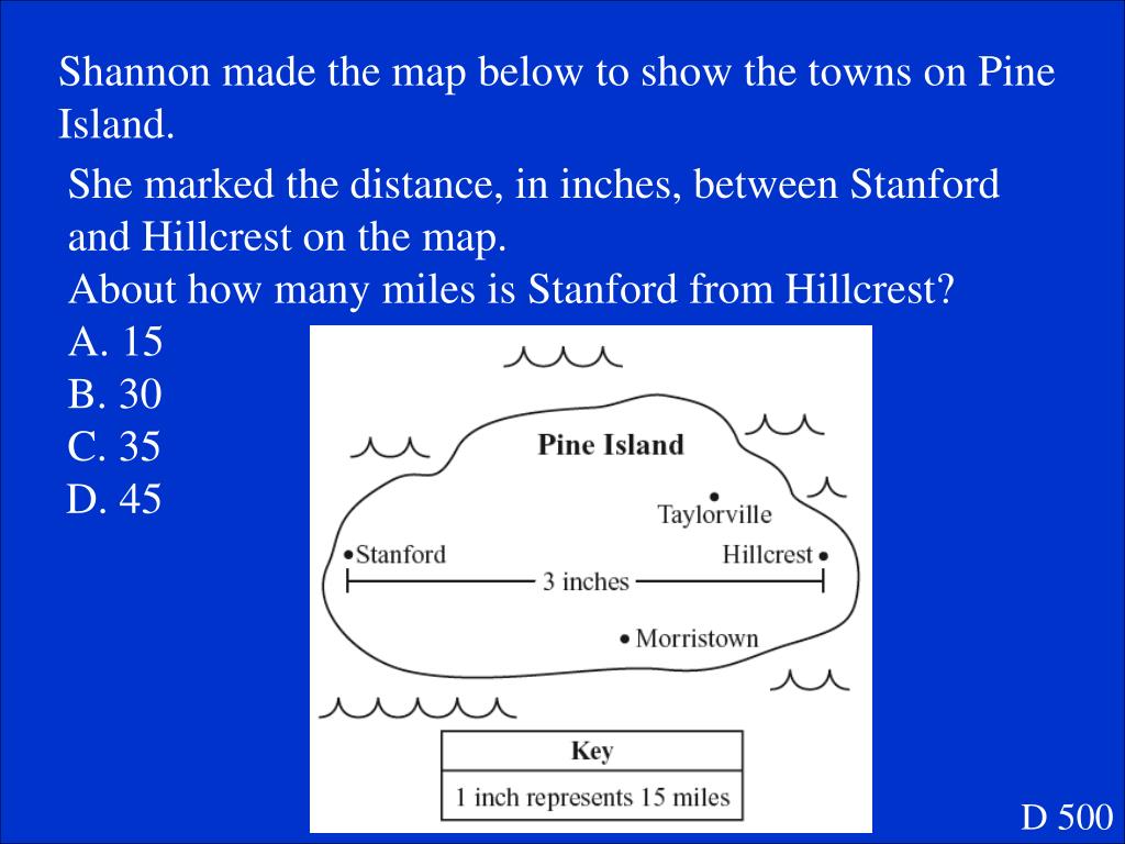 Shannon made the map below to show the towns on Pine Island. • She marked the distance, in inches, between Stanford and Hillcrest on the map. • About how many miles is Stanford from Hillcrest? • A. 15 • B. 30 • C. 35 • D. 45 D 500