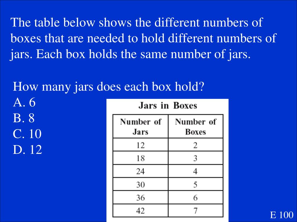 The table below shows the different numbers of boxes that are needed to hold different numbers of jars. Each box holds the same number of jars. How many jars does each box hold? A. 6 B. 8 C. 10 D. 12 E 100