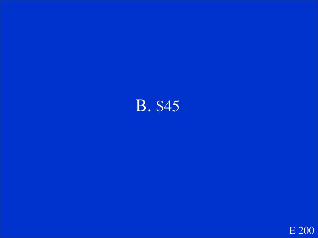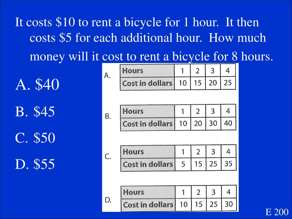 It costs $10 to rent a bicycle for 1 hour. It then costs $5 for each additional hour. How much money will it cost to rent a bicycle for 8 hours. $40 $45 $50 $55 E 200