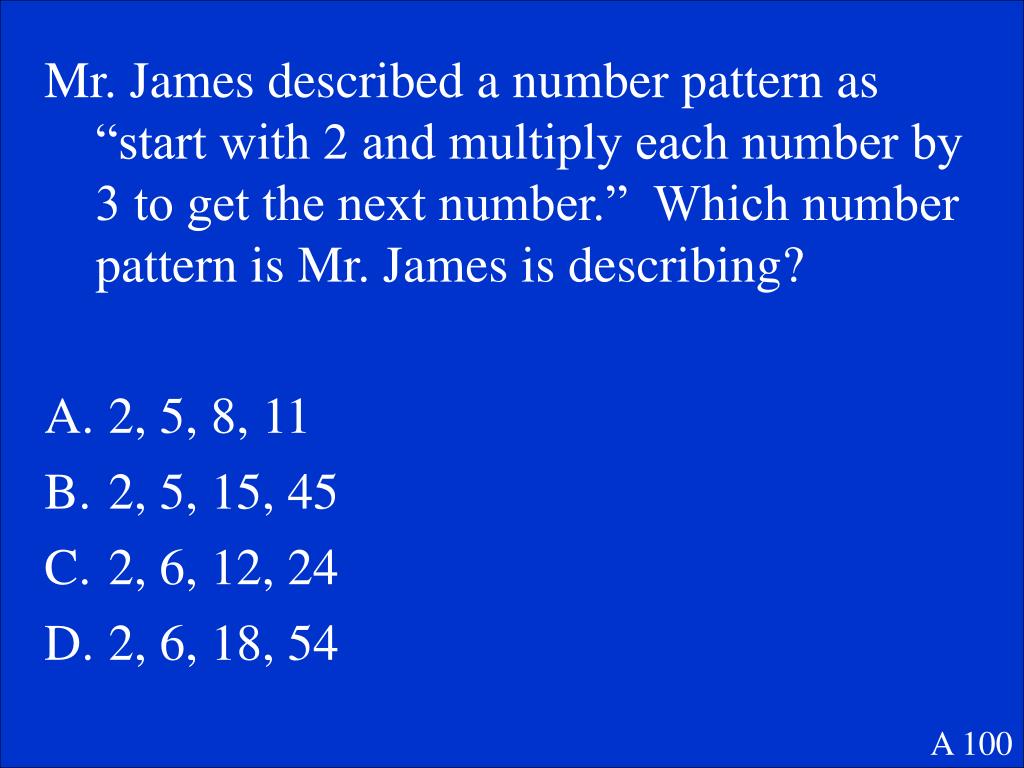 Mr. James described a number pattern as “start with 2 and multiply each number by 3 to get the next number.” Which number pattern is Mr. James is describing? 2, 5, 8, 11 2, 5, 15, 45 2, 6, 12, 24 2, 6, 18, 54 A 100