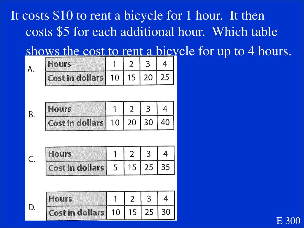 It costs $10 to rent a bicycle for 1 hour. It then costs $5 for each additional hour. Which table shows the cost to rent a bicycle for up to 4 hours. E 300
