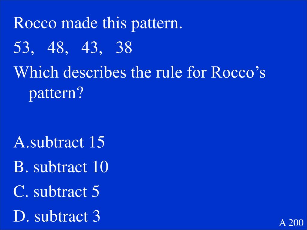 Rocco made this pattern. 53, 48, 43, 38 Which describes the rule for Rocco’s pattern? subtract 15 subtract 10 subtract 5 subtract 3 A 200