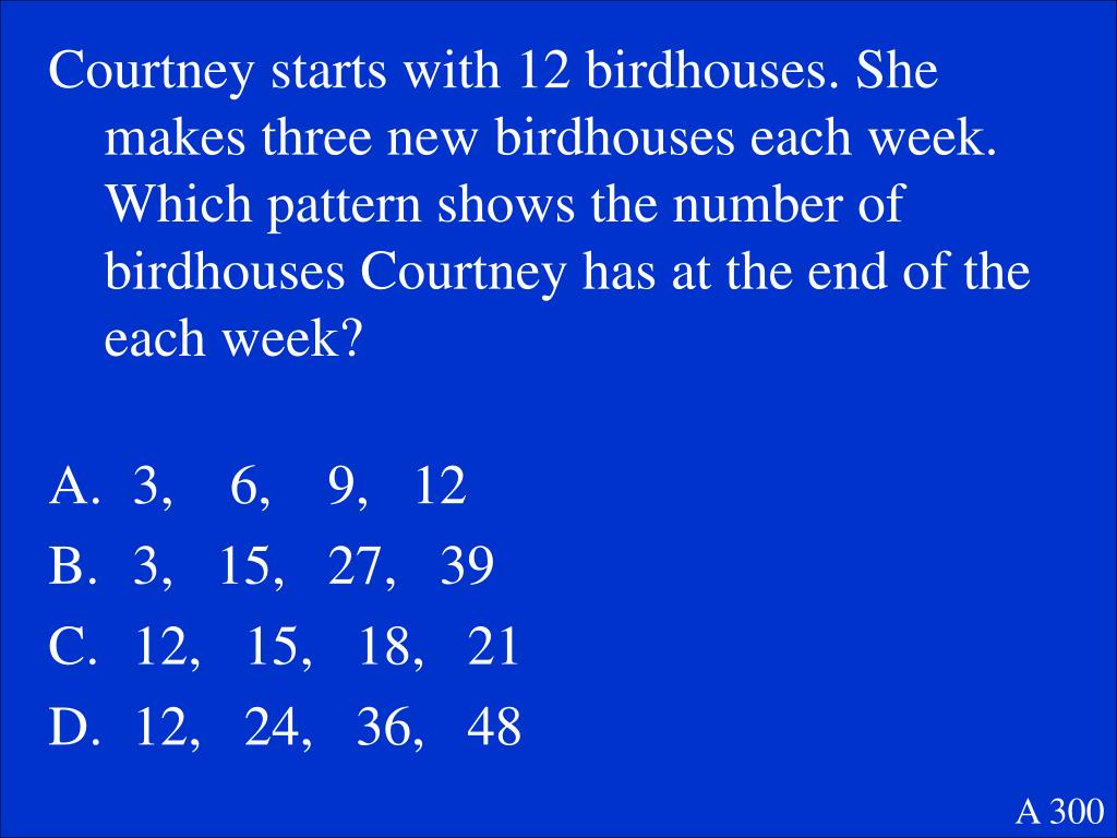 Courtney starts with 12 birdhouses. She makes three new birdhouses each week. Which pattern shows the number of birdhouses Courtney has at the end of the each week? 3, 6, 9, 12 3, 15, 27, 39 12, 15, 18, 21 12, 24, 36, 48 A 300