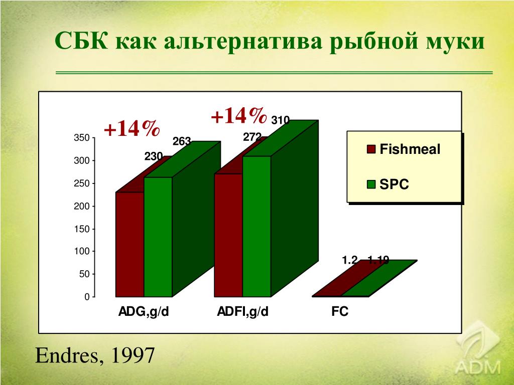 СБК как альтернатива рыбной муки +14% +14% Endres, 1997