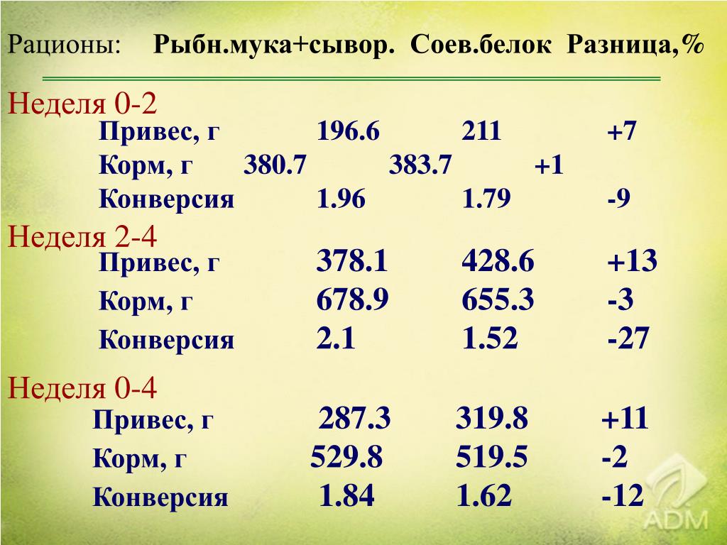Рационы:Рыбн.мука+сывор.Соев.белокРазница,%Рационы:Рыбн.мука+сывор.Соев.белокРазница,% Неделя 0-2 Привес, г196.6 211 +7 Корм, г380.7 383.7 +1 Конверсия 1.96 1.79 -9 Неделя 2-4 Привес, г378.1 428.6 +13 Корм, г678.9 655.3 -3 Конверсия 2.1 1.52 -27 Неделя 0-4 Привес, г 287.3 319.8 +11 Корм, г529.8 519.5 -2 Конверсия 1.84 1.62 -12