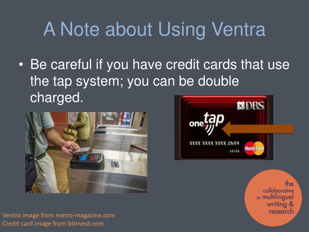 A Note about Using Ventra • Be careful if you have credit cards that use the tap system; you can be double charged. Ventra image from metro-magazine.com Credit card image from btinvest.com