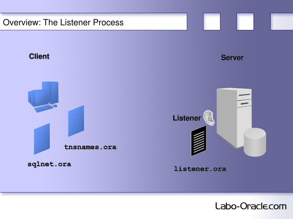 Overview: The Listener Process Client Server Listener tnsnames.ora sqlnet.ora listener.ora