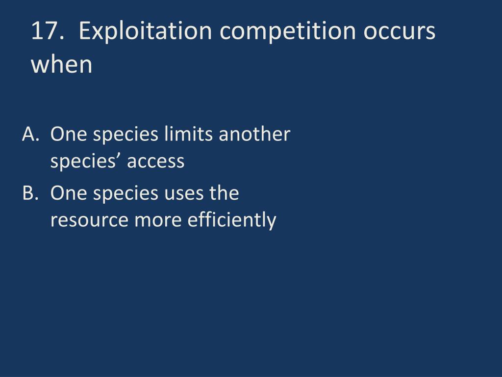 17. Exploitation competition occurs when • One species limits another species’ access • One species uses the resource more efficiently