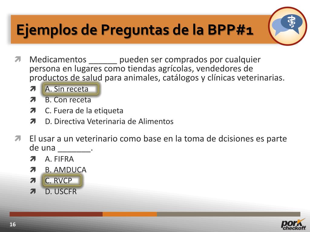 Ejemplos de Preguntas de la BPP#1 • Medicamentos ______ pueden ser compradosporcualquier persona en lugarescomotiendasagrícolas, vendedores de productos de saludparaanimales, catálogos y clínicasveterinarias. • A. Sin receta • B. Con receta • C. Fuera de la etiqueta • D. DirectivaVeterinaria de Alimentos • El usar a un veterinariocomo base en la toma de dcisioneses parte de una _______. • A. FIFRA • B. AMDUCA • C. RVCP • D. USCFR