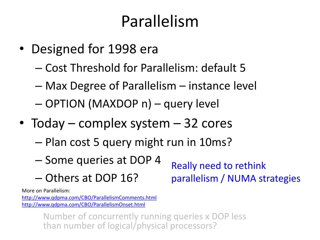 Parallelism • Designed for 1998 era • Cost Threshold for Parallelism: default 5 • Max Degree of Parallelism – instance level • OPTION (MAXDOP n) – query level • Today – complex system – 32 cores • Plan cost 5 query might run in 10ms? • Some queries at DOP 4 • Others at DOP 16? Really need to rethink parallelism / NUMA strategies More on Parallelism: http://www.qdpma.com/CBO/ParallelismComments.html http://www.qdpma.com/CBO/ParallelismOnset.html Number of concurrently running queries x DOP less than number of logical/physical processors?