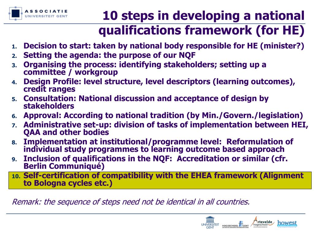 10 steps in developing a national qualifications framework (for HE) Decision to start: taken by national body responsible for HE (minister?) Setting the agenda: the purpose of our NQF Organising the process: identifying stakeholders; setting up a committee / workgroup Design Profile: level structure, level descriptors (learning outcomes), credit ranges Consultation: National discussion and acceptance of design by stakeholders Approval: According to national tradition (by Min./Govern./legislation) Administrative set-up: division of tasks of implementation between HEI, QAA and other bodies Implementation at institutional/programme level: Reformulation of individual study programmes to learning outcome based approach Inclusion of qualifications in the NQF: Accreditation or similar (cfr. Berlin Communiqué) Self-certification of compatibility with the EHEA framework (Alignment to Bologna cycles etc.) Remark: the sequence of steps need not be identical in all countries.