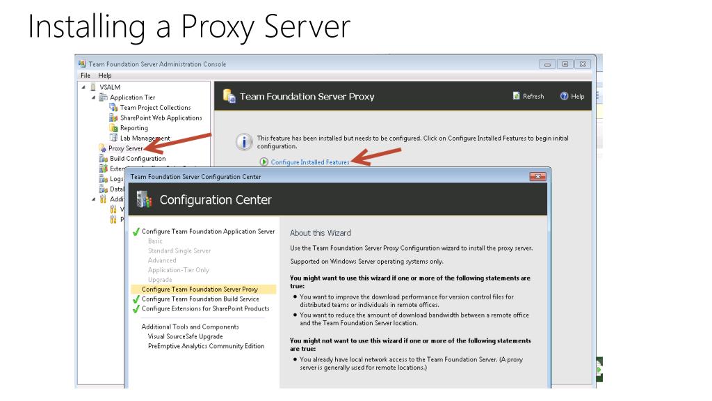 Proxy.config <?xml version="1.0" encoding="utf-8"?> <ProxyConfigurationxmlns:xsd="http://www.w3.org/2001/XMLSchema" xmlns:xsi="http://www.w3.org/2001/XMLSchema-instance"> <Servers> <Server><Uri>http://vsalm:8080/tfs/fabrikamfibercollection/</Uri></Server> <Server> <Uri>http://vsalm:8080/tfs/tailspintoyscollection/</Uri> </Server> </Servers> <!-- Proxy file cache root folder --> <CacheRoot>C:\Program Files\Microsoft Team Foundation Server 11.0\Version Control Proxy\_tfs_data</CacheRoot> <CacheLimitPolicy> … <!-- Cache limit expressed as percentage of disk space --> <PercentageBasedPolicy>75</PercentageBasedPolicy> <!-- Cache limit expressed as MB --> <!-- <FixedSizeBasedPolicy></FixedSizeBasedPolicy> --> </CacheLimitPolicy>