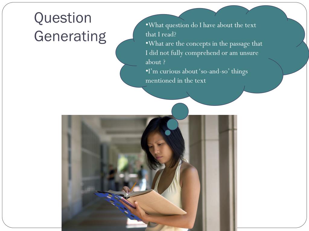 Question Generating • By generating questions, students become aware of whether they can answer the questions and if they understand what they are reading. • Students learn to ask themselves questions that require them to combine information from different segments of text.