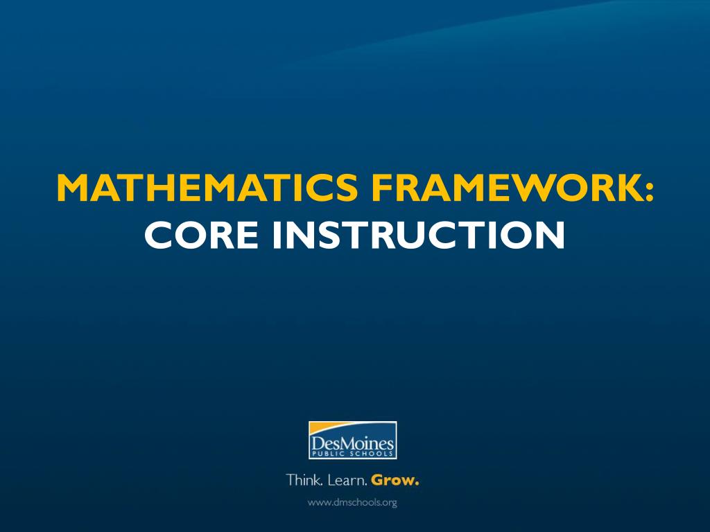 DMPS: Mathematics Framework60 – 90 minutes daily Review of prerequisite skills or previously instructed content that was not mastered. Daily Math Review Mental Math 3 – 5 multi-step questions completed daily. Questions are aligned with what is currently being taught during core instruction. Whole Group Instruction Conceptual Understanding, Procedural Knowledge and Application Instruction Small Group Instruction Scaffold differentiated instruction that occurs 3-5 times per week Fact Fluency Practice Fact practice to build automaticity that occurs daily (Grades 2-5)