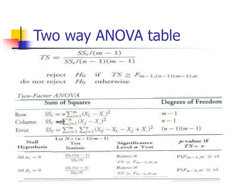 Two-way ANOVA approach (ii) Supposed an additive model for cell mean, composed by ai and bj The cell mean of size k or other The ith row mean The total mean The jth column mean Average row factor Average column factor The ith row mean=the average column factor+ the specific ith row factor Deviation from average row factor, column factor j j &