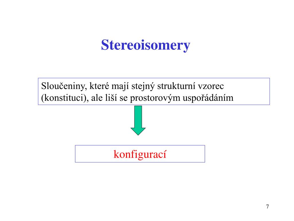 Stereoisomery Sloučeniny, které mají stejný strukturní vzorec (konstituci), ale liší se prostorovým uspořádáním konfigurací