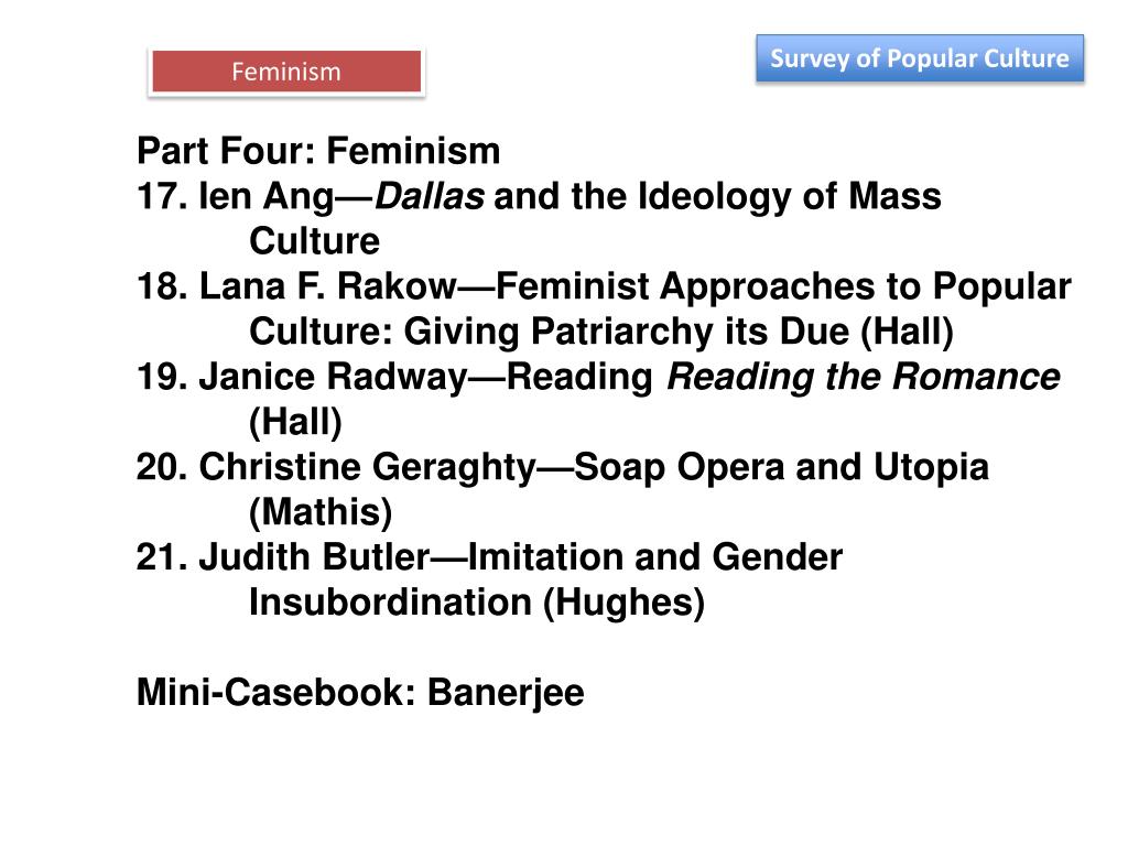 Survey of Popular Culture Feminism Part Four: Feminism 17. Ien Ang—Dallas and the Ideology of Mass Culture 18. Lana F. Rakow—Feminist Approaches to Popular Culture: Giving Patriarchy its Due (Hall) 19. Janice Radway—Reading Reading the Romance (Hall) 20. Christine Geraghty—Soap Opera and Utopia (Mathis) 21. Judith Butler—Imitation and Gender Insubordination (Hughes) Mini-Casebook: Banerjee