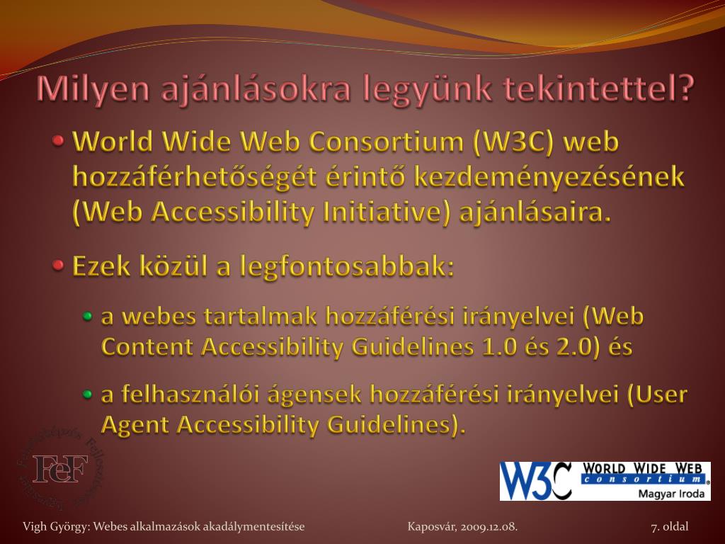 Milyen ajánlásokra legyünk tekintettel? • World Wide Web Consortium (W3C) web hozzáférhetőségét érintő kezdeményezésének (Web AccessibilityInitiative) ajánlásaira. • Ezek közül a legfontosabbak: • a webes tartalmak hozzáférési irányelvei (Web ContentAccessibilityGuidelines 1.0 és 2.0) és • a felhasználói ágensek hozzáférési irányelvei (UserAgentAccessibilityGuidelines). Vigh György: Webes alkalmazások akadálymentesítése Kaposvár, 2009.12.08.